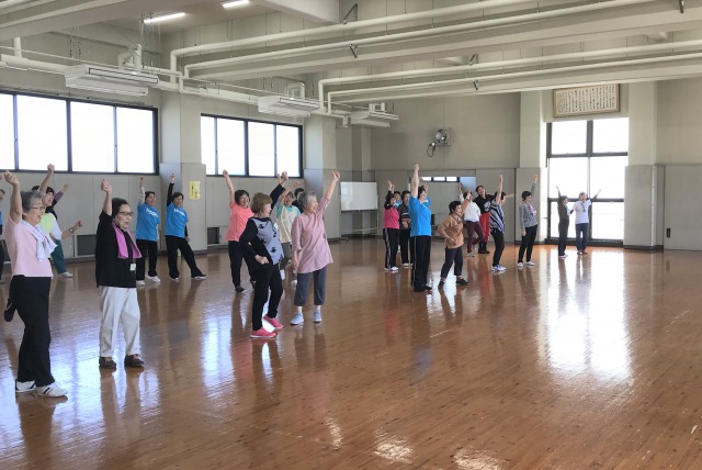 本日より、泉大津市との共催ではじめての健康ダンス教室がスタート シニアダンス 公開日:2018年5月10日 泉大津市では今年度で3年目を迎え、1年前、2年前の先輩ダンスリーダーの皆さんにボランティアスタッフとして応援に駆けつけていただきました。受付から血圧測定の補助、レッスンの盛り上げまで大活躍です。レッスンの最後には今年度から参加した皆さんの先頭に立ってダンスのお手本を見せていただきました。今年度もダンスの輪がさらに広がる予感です。 はじめての健康ダンス教室について