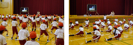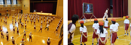 - 〇大人数での授業では、列の後方の児童はインストラクターの動きを確認しづらいが、ビッグパッドへ投影することで動きを確認しやすくなり、1回の授業で多くの児童に振付を習得させることが可能となった。